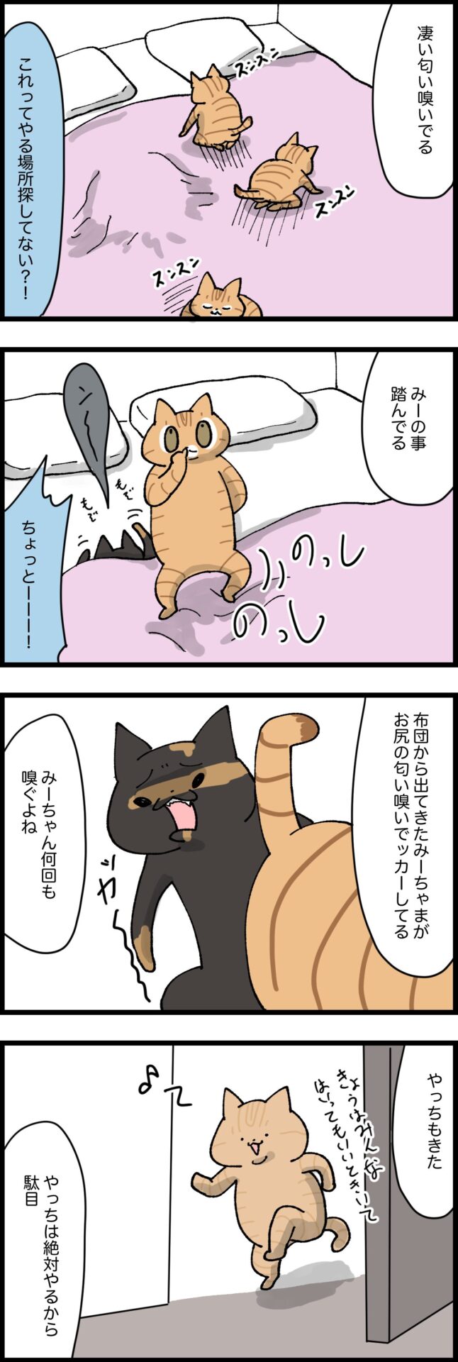 寝室が許されているメンバーはらいや、ふうや、たもん、みろくの4猫です。