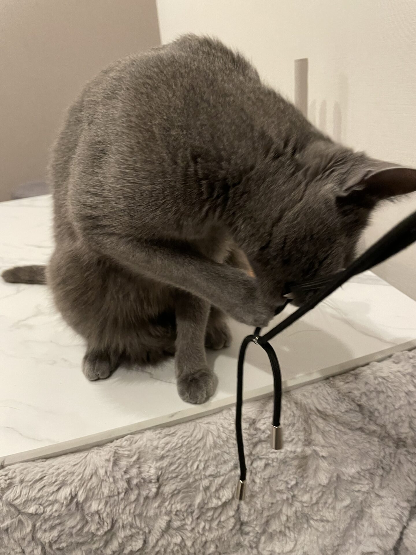 ヒモを見つめる可愛い顔