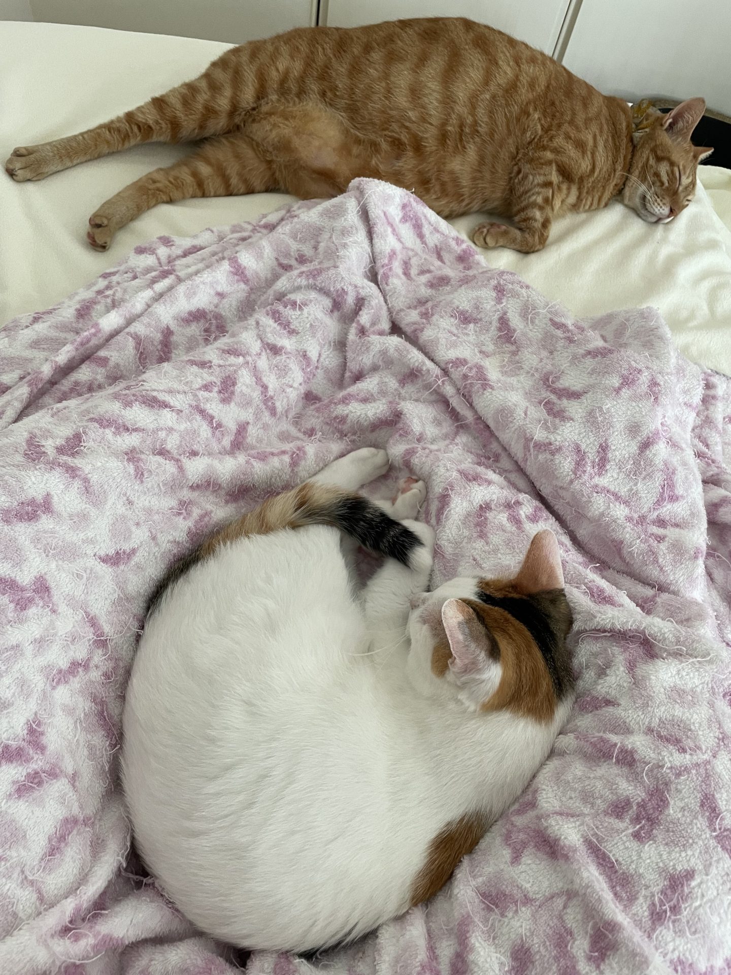 足の間で眠るしゅりーちゃんとなんか下の方で寝ているかるくん
