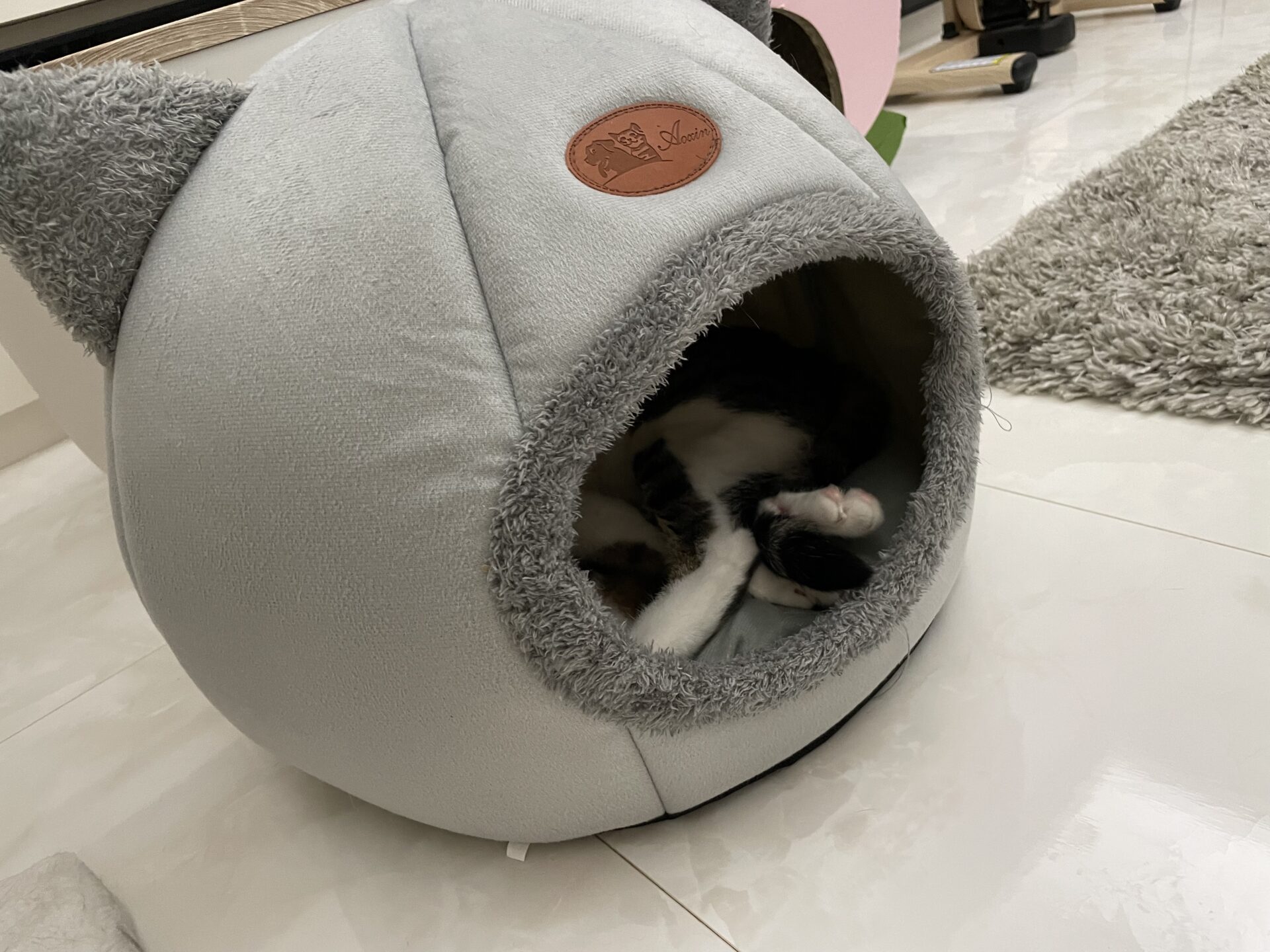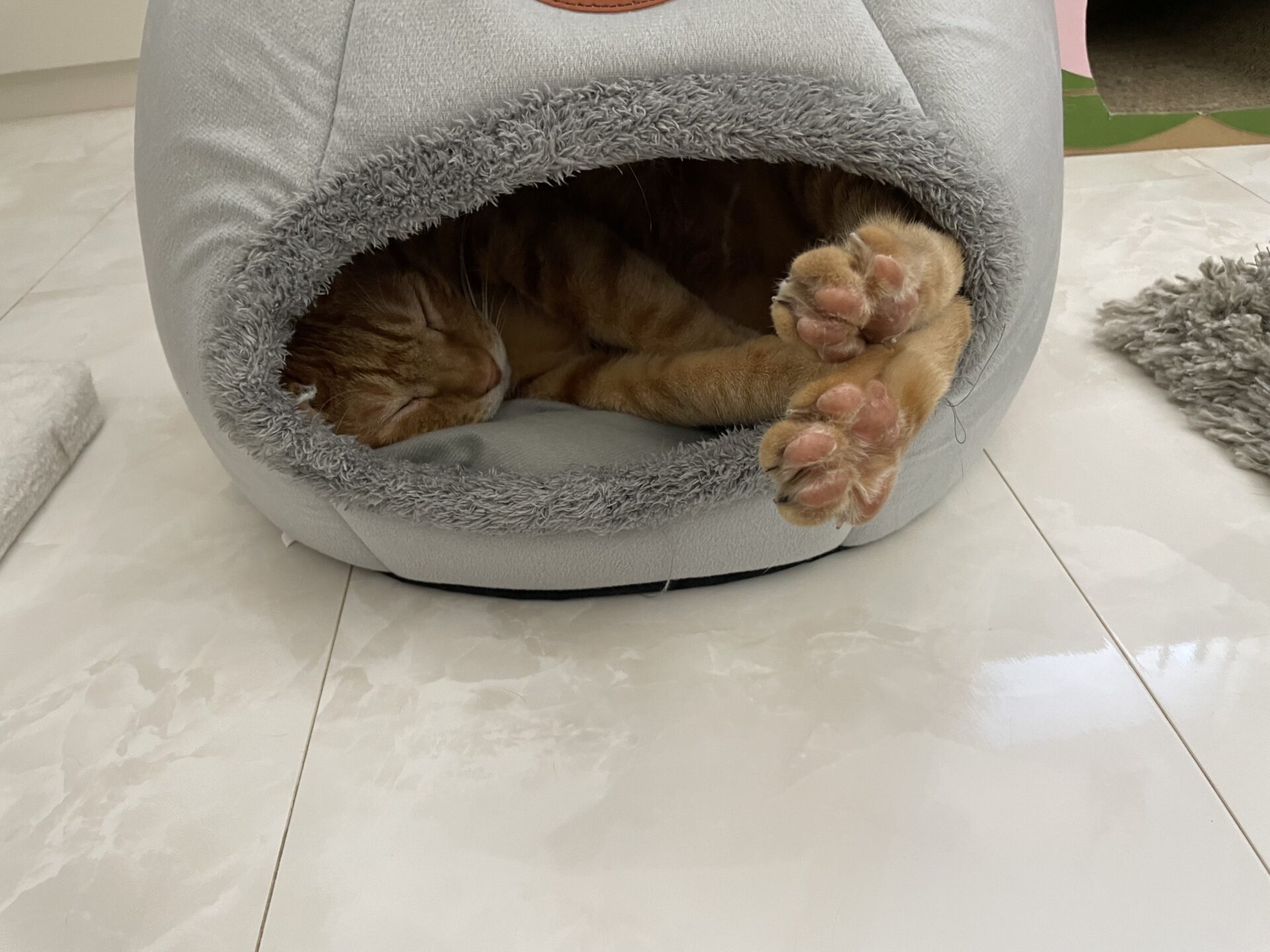 かるくんが寝るにはちょっと小さい気もするけどご機嫌そう